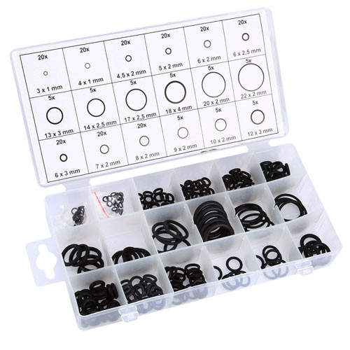 Набір із 225 гумових ущільнювальних кілець (О-рингів) призначені для автомобільних кондиціонерів і не тільки. Чудово підійде для особистих і професійних майстерень, гаражів і сантехнічних послуг.